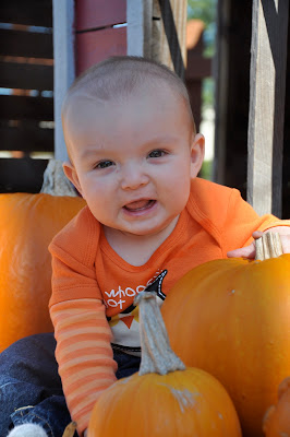 Last week my friend Melanie and I took our boys to the pumpkin patch. Yes, they're only 5 & 8 months old, but every child needs a fall picture in a pumpkin patch. So, we planned to meet at a church pumpkin patch that was close to her house. I got there first and realized there was no one there. I drove around the parking lot until I saw a sign that said Pumpkin Patch open 11 to dark. It was 10. I called her to let her know it wasn't open yet, but she was right around the corner. When she got there, she parked beside me so we could decided what we wanted to do. She started to convince me that there was no gate, no fence, we weren't going to steal pumpkins, we just wanted pictures, and we'd be done before anyone got there. I didn't really need convincing. I figured they trusted that no one was going to come steal pumpkins, or they'd have more security. I'm confessing all this, because we may have broke into a church pumpkin patch. But honestly, we just took pictures!!